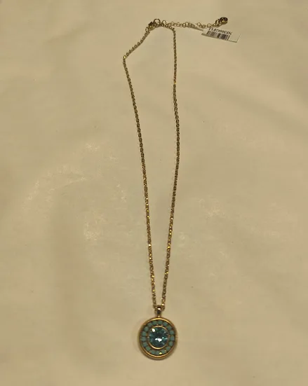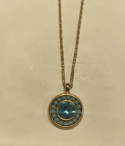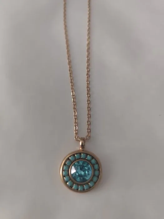 שרשרת מפותלת מצופה זהב 24 קראט עם תליון מלכותי עגול משובץ קריסטל גדול של סברובסקי וסביבו שתי שרשרת של קריסטלים קטנטנים.