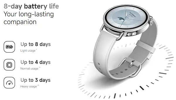 חיי סוללה ארוכים 320mAh Li-Polymer (עד 8 ימים בשימוש חסכוני, עד 4 ימים בשימוש רגיל ו- 3 ימים בשימוש עם תצוגה תמידית-AOD).