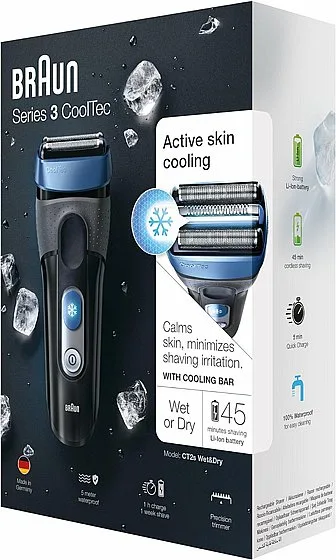 Braun CT2s CoolTec היא מכונת גילוח חדשנית לגברים עם טכנולוגיית קירור ייחודית המפחיתה באופן מיידי את תחושת החום והגירוי בעור במהלך הגילוח – ללא צורך בג'ל, קרם או מים.