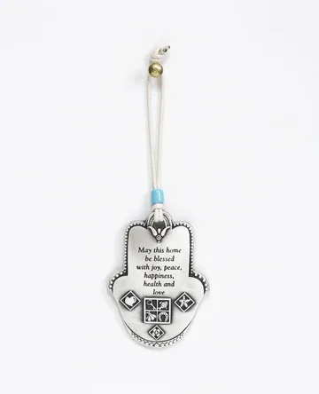 מתלה חמסה ברכת הבית בשפה האנגלית, מצופה כסף טהור, בעיצוב ייחודי. החמסה מעוטרת בתבליטים גיאומרטיים המסמלים שפע, פיריון, הצלחה ושמירה מפני עין הרע.