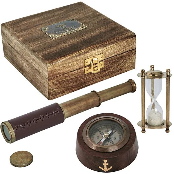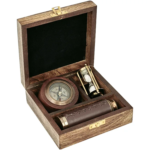 סט כולל מצפן 4205 שעון חול וטלסקופ בקופסת עץ וינטג'