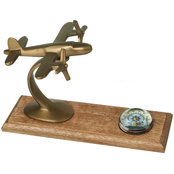מעמד שולחני מטוס עשוי נחושת בסיס עץ משולב עם מצפן