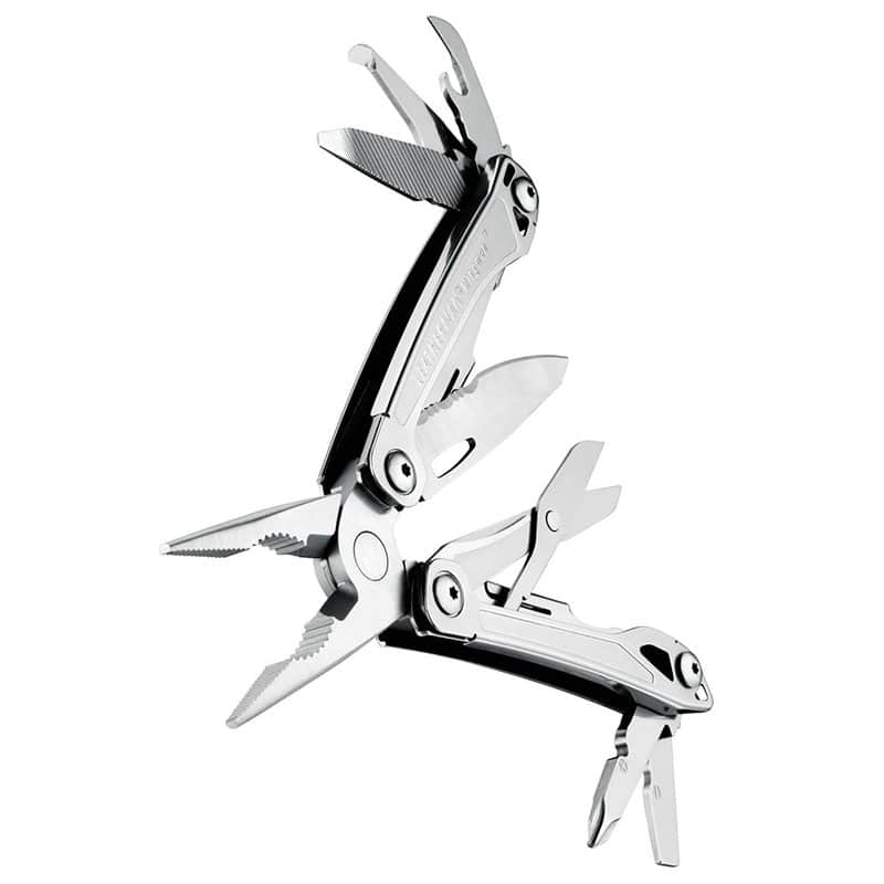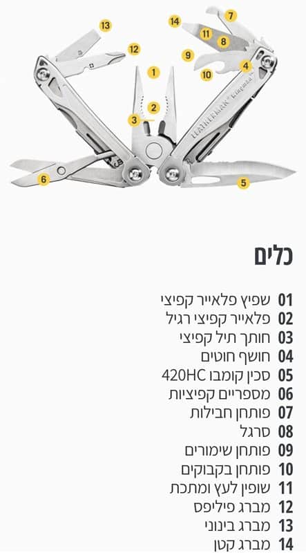 כלי נוח לשימוש מפלדת אל-חלד, עם פתיחה פטנטית של להבים ביד אחת ופלאייר פטנטי-קפיצי.