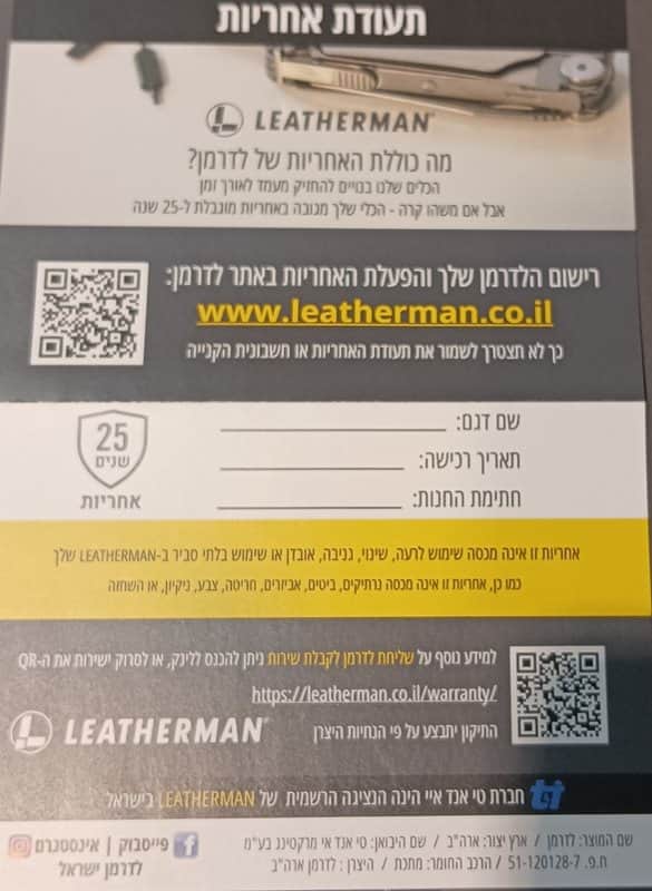 אחריות לכלי לדרמן LEATHERMAN היא ל-25 שנים על ידי היבואן הרשמי בישראל.