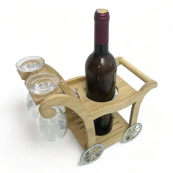 מעמד עגלה לבקבוק יין עשוי במבוק + 2 כוסות 1329
