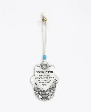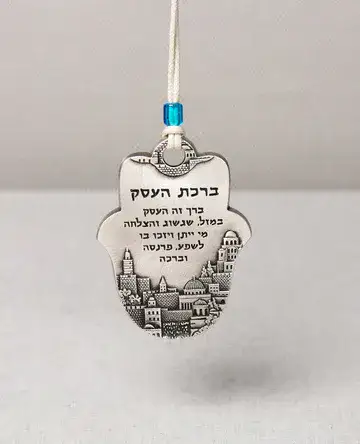 על חלקה התחתון של החמסה חרוטה תמונת ירושלים היפה ובחלקה העליון מילים שמברכות לשפע, מזל, שגשוג, הצלחה ופרנסה טובה.