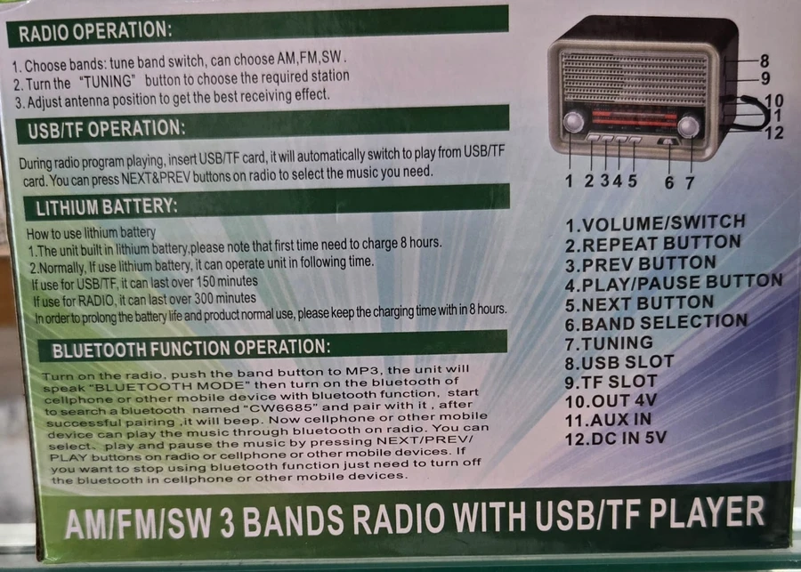 FM: 88-108 MHz AM: 530-1600 KHz SW: 5.9-18.0 MHz