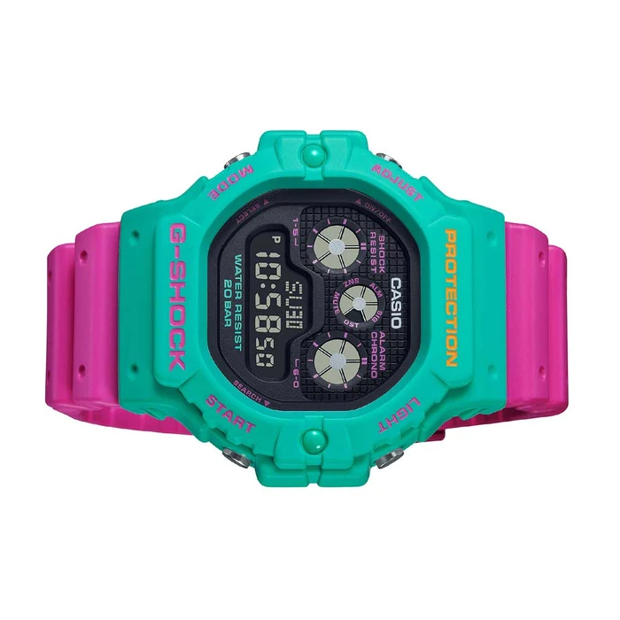 שעון יד דיגיטלי ג'י-שוק. חגיגות הקיץ בעיצומן עם דגם ניאון צבעוני מיוחד. פרט לעיצוב הקייצי, מדובר בדגם ג'ישוק כרונוגרף מתומן, עמיד ל-200 מטר, סטופר, טיימר התראות ותאורה אחורית חזקה במיוחד ועוד.