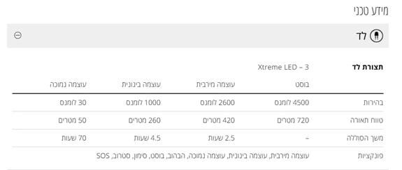 עוצמה מירבית, עוצמה בינונית, עוצמה נמוכה, הבהוב, בוסט, סימון, סטרוב, SOS