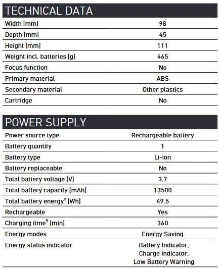 – בנק האנרגיה החזק מונע על ידי סוללה נטענת חזקה פנימית אשר מזינה את נורת הפנס ומאפשרת שימוש גם בנק אנרגיה נייד בתפוקה של 13500 mAh.