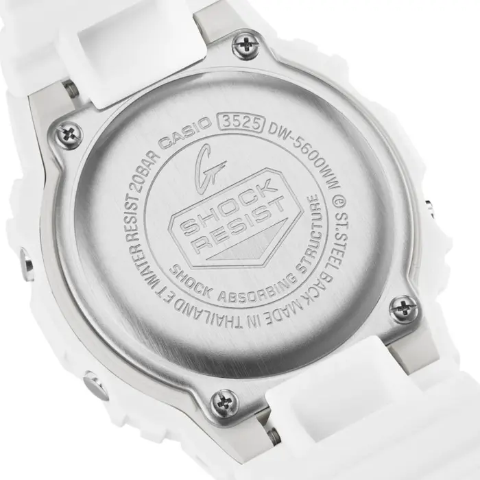DW-5600WW-7DR הוא שעון המשלב עיצוב עירוני ועמידות חסרת פשרות בשטח. סכימת צבע מונוכרומטית (לבן על לבן) – מארז, מסגרת, רצועה ואפילו זכוכית השעון בלבן. השריון החיצוני עשוי סיליקון עמיד, רך ונעים למגע. בנוסף לעיצוב נקי ועמיד השעון מציע גם תכונות טכנולוגיות שימושיות כגון: סטופר, טיימר, שעון מעורר ״מולטי״, סוללה עמידה לכ – 5 שנים תאריכון אוטומטי מלא עמידות למים בשחיה וספורט ימי (לא לצלילת מיכלים) ועוד.