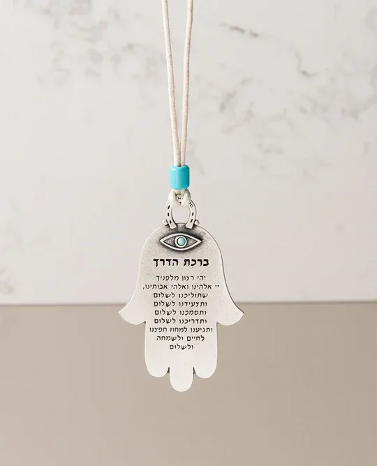 בצדה השני של החמסה מוטבעת עיין משובצת באבן בצבע טורקיז ומתחתיה כתובה תפילת הדרך.
